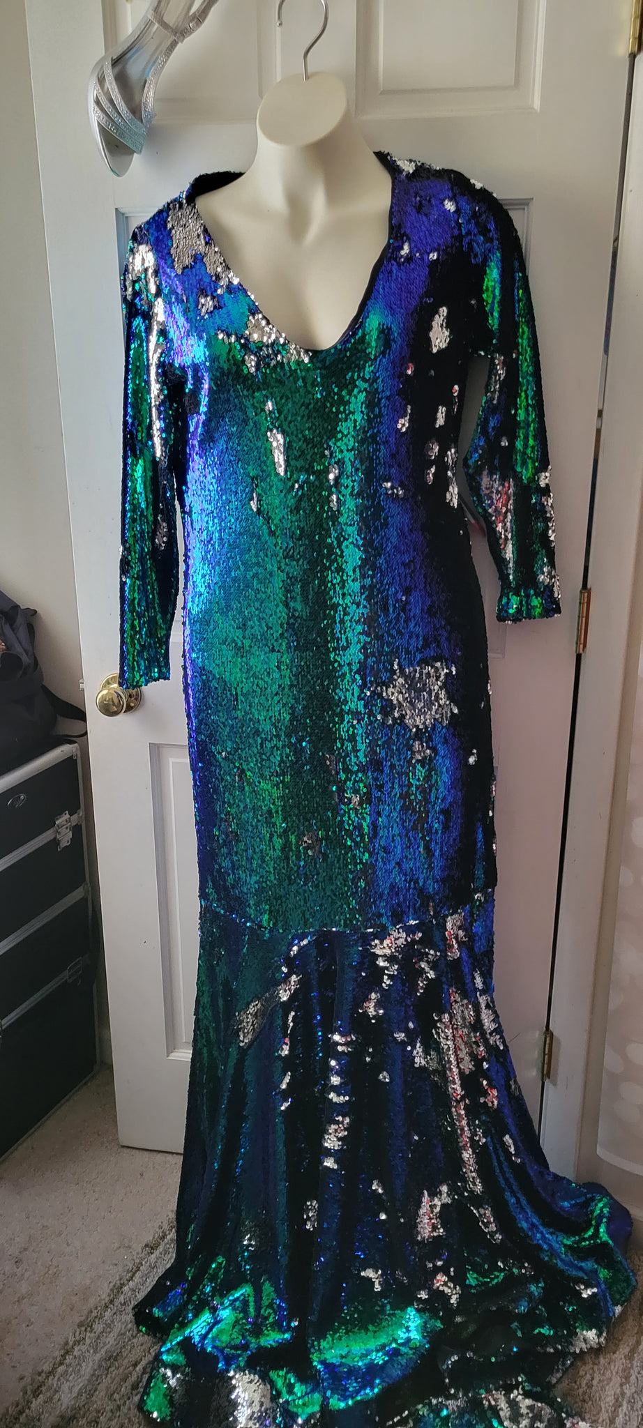 This is a beautiful green blue and silver sequin reversible mermaid gown with a hymn train.