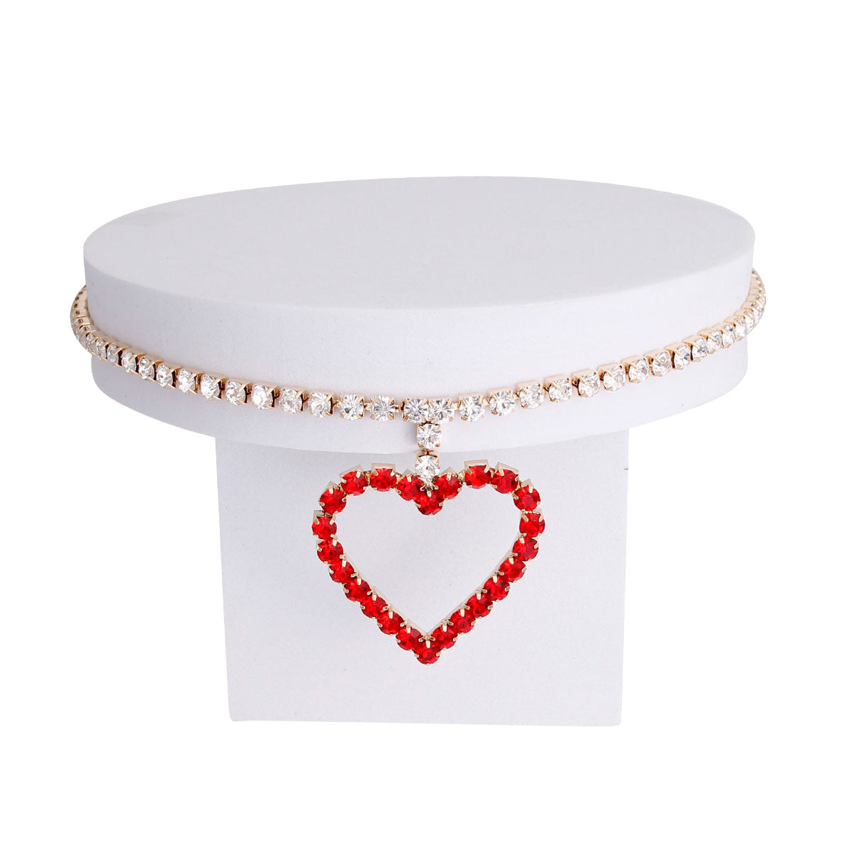 Gold Metal and Clear Rhinestone Collar Choker Necklace Featuring Red Rhinestone Heart Pendant. Pendant measures 2" x 2"