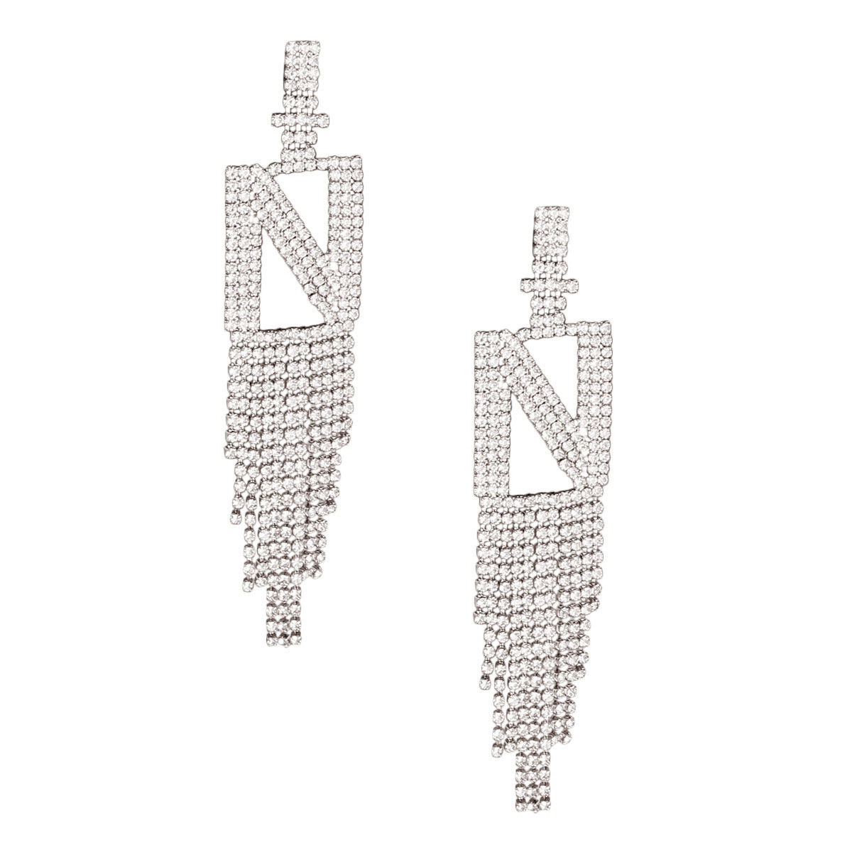 Silver and Clear Rhinestone Initial N Earrings Featuring Fringe Detail. Earrings measure 1 inch wide