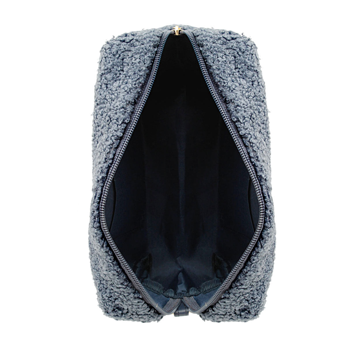 Navy Fleece Fur Rectangle Zipper Pouch Wristlet Featuring Multi Color FAITH Detail. 100% Polyester. Main Zipper Closure. Detachable Wrist Strap Included.