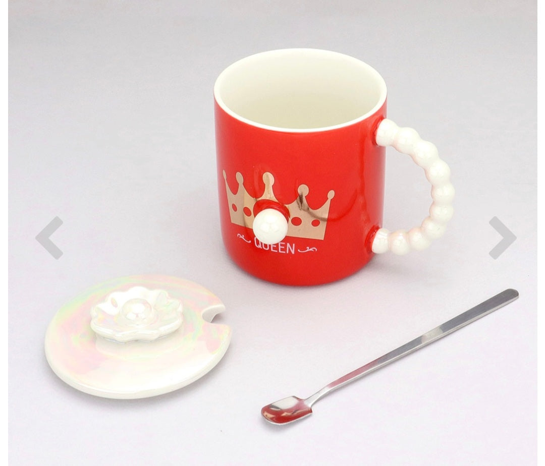 This is a beautiful red queen mug with pearl handle. It comes complete with a spoon and topper.